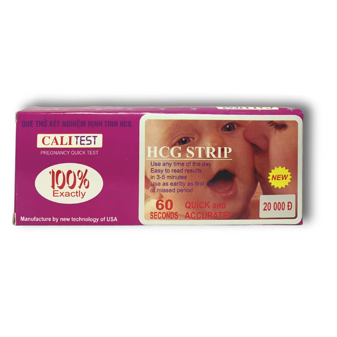 Que thử thai Cali Test là dụng cụ xét nghiệm thai sớm tại nhà, giúp phát hiện nồng độ hormone HCG trong nước tiểu một cách nhanh chóng và chính xác. Sản phẩm được sản xuất theo tiêu chuẩn ISO 9001:2008, đảm bảo độ tin cậy cao.